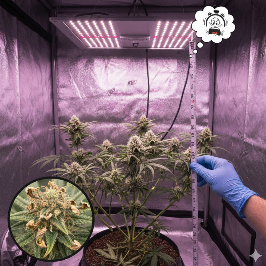 Licht ist das „Essen“ der Pflanze. Aber: Hängt die Lampe zu weit weg, „spargelt“ die Pflanze (sie wird dünn und instabil). Hängt sie zu nah dran, verbrennen die Blätter durch die Hitze oder den zu starken Lichtstress.
